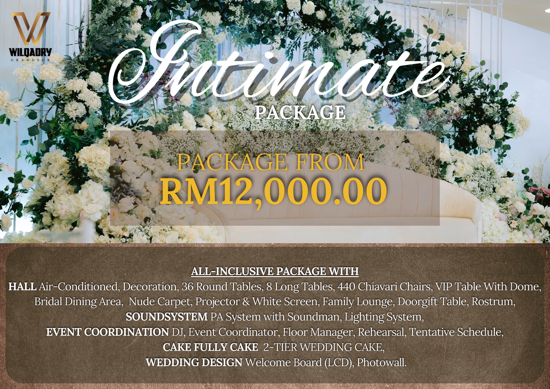 This package includes a fully air-conditioned hall with elegant decorations, 36 round tables, 8 long tables 440 Chiavari chairs, and a VIP table with dome set. It also comes with a bridal dining area, nude carpet, projector and white screen, family lounge, doorgift table, and rostrum.